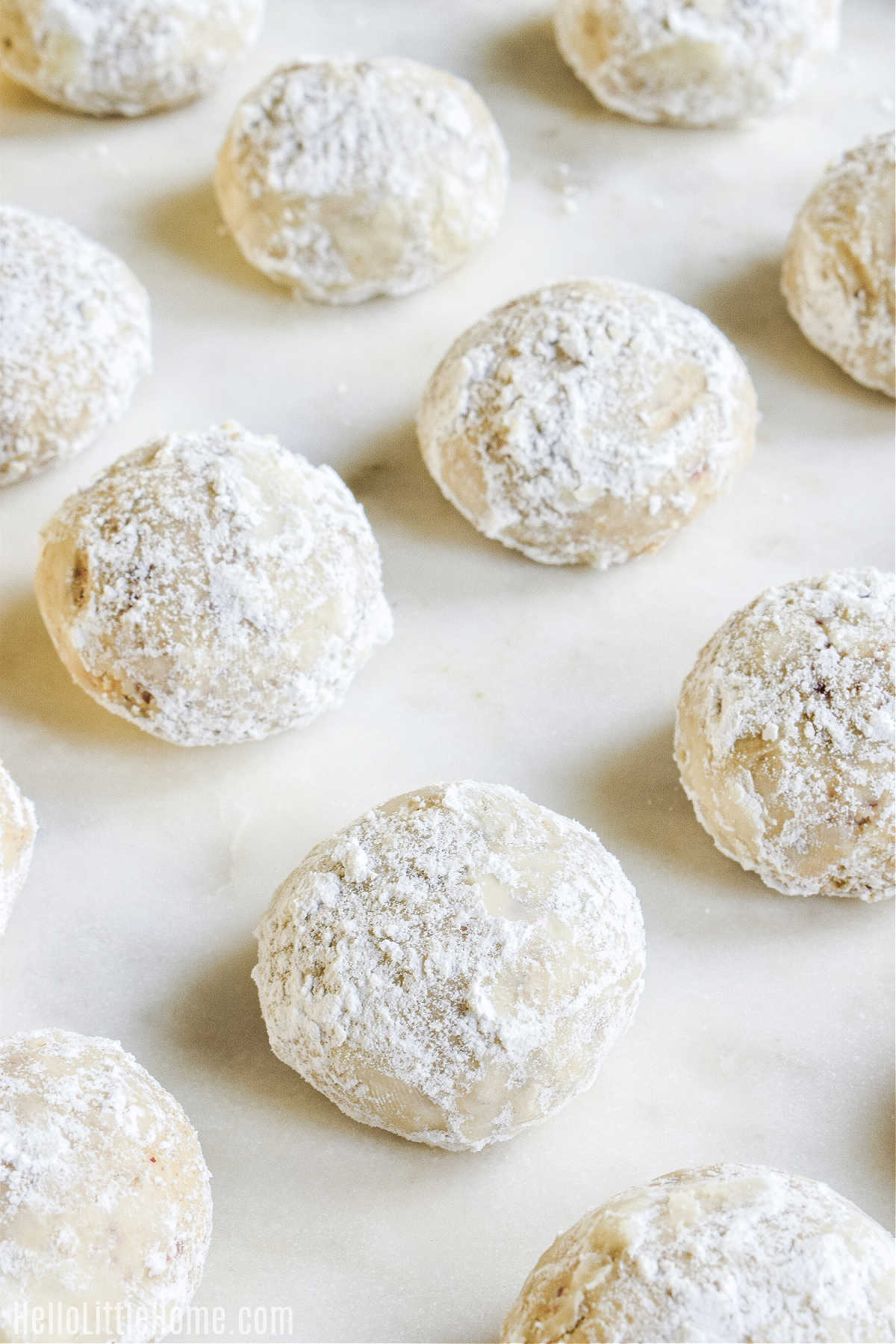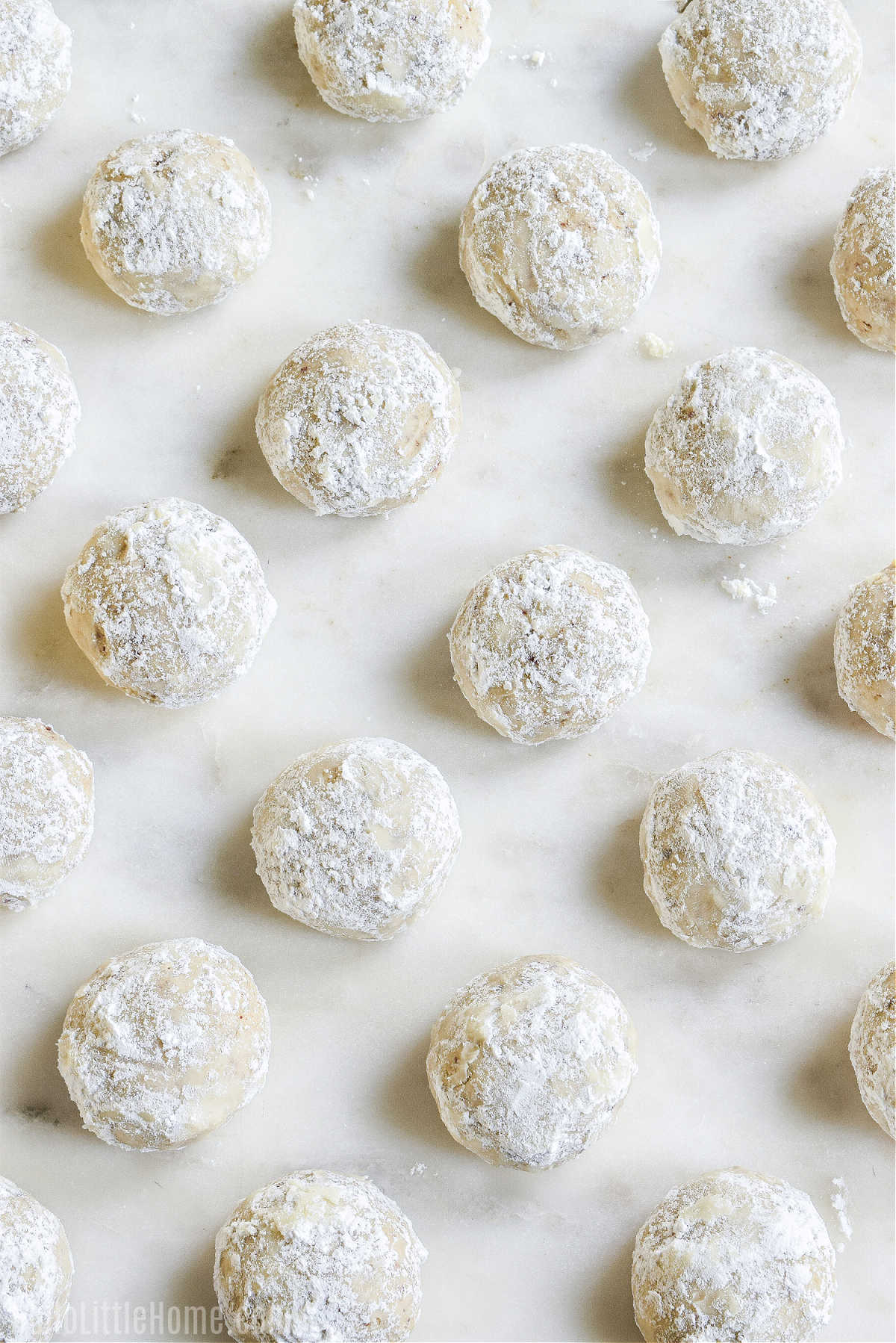 - Once the cookies have cooled completely, roll them in the powdered sugar a second time. (Add more powdered sugar to your bowl, as needed).