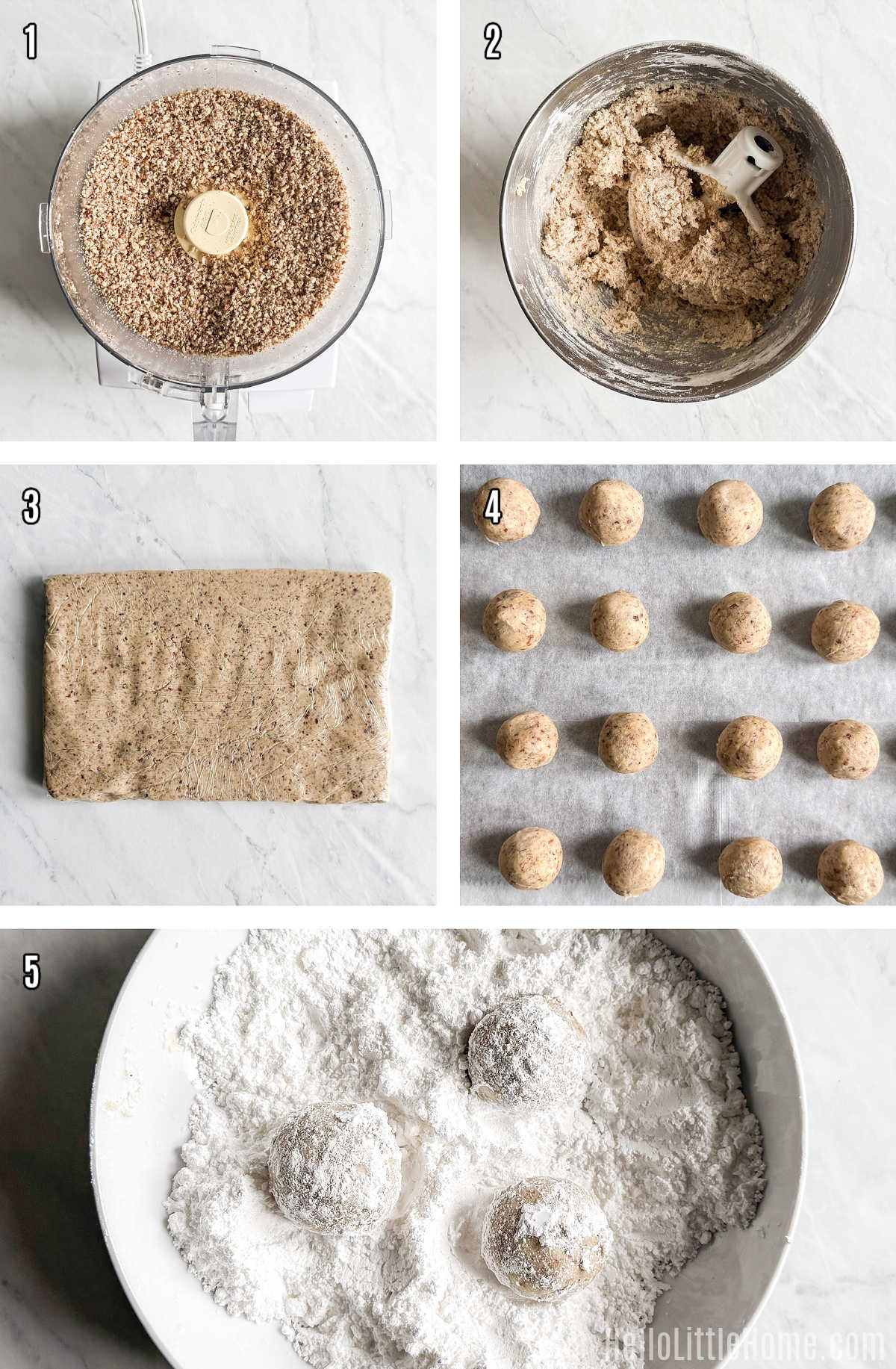 These powdered sugar covered Pecan Balls are super easy to make! You'll find a detailed recipe card below, but here's a quick overview of the steps: