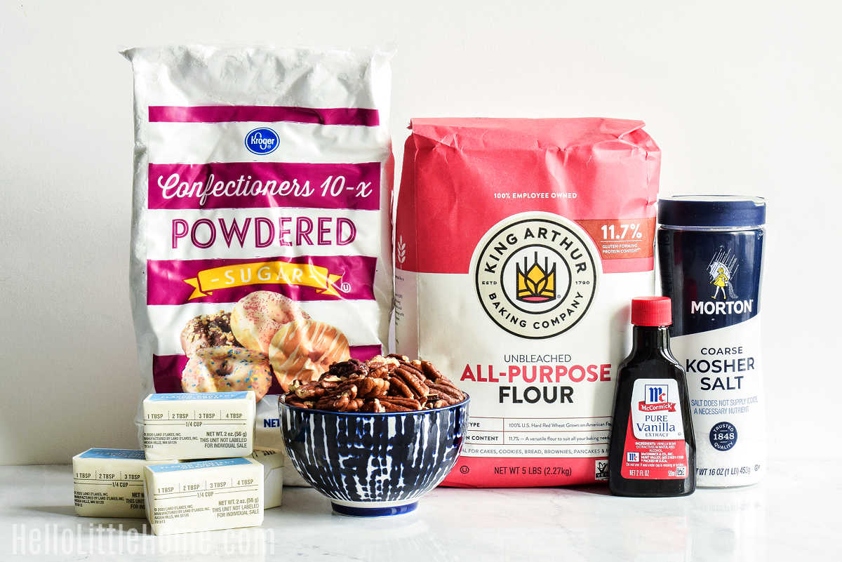 - Make dough. Next, you'll prep the dough. Start by creaming the butter and powdered sugar together. Then add the vanilla extract and water. Finally, blend in the flour, pecans, and salt. Tip: The dough is fairly thick, so a stand mixer will work best. Once the flour is blended in gradually turn up the speed, and keep mixing just until the dough comes together.
